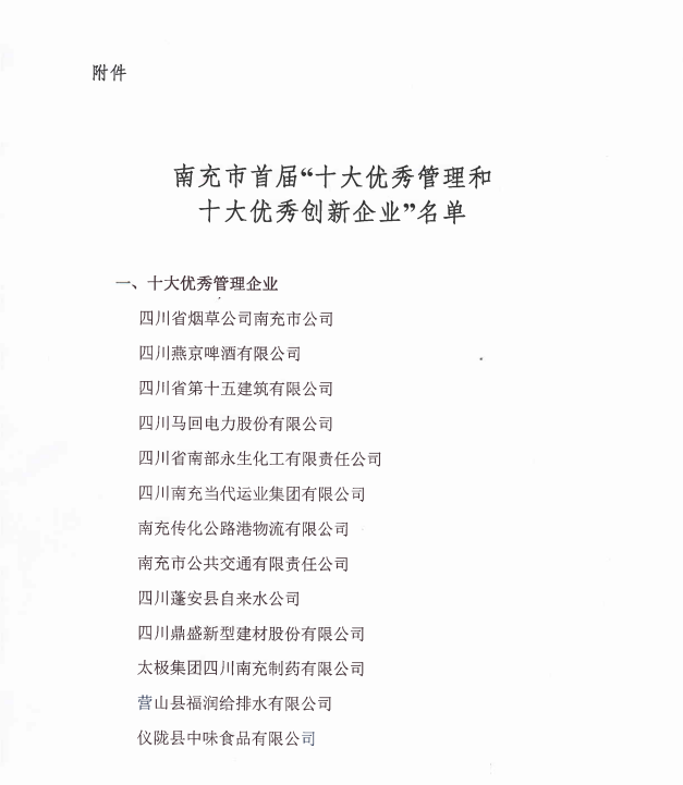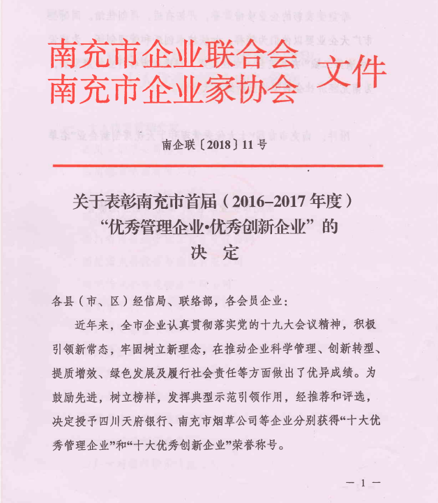 关于表彰南充市首届(2016-2017年度)“优秀管理企业?优秀创新企业”的决定